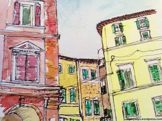 So now I am experimenting with this style of drawing, using various art pens or using a dip pen with nibs. All these sketches, save the Portofino one below, I went directly (and quickly) with ink to paper (no thinking, lots of mistakes, but just GO). And I am experimenting with adding colour – going spare with washes like the Camerino one above or adding more colour as shown in most of the pieces below. I have very little experience with watercolour and I am learning lots about how beautiful but how tricky it can be. Anyone out there want to share their best watercolour tips with me?