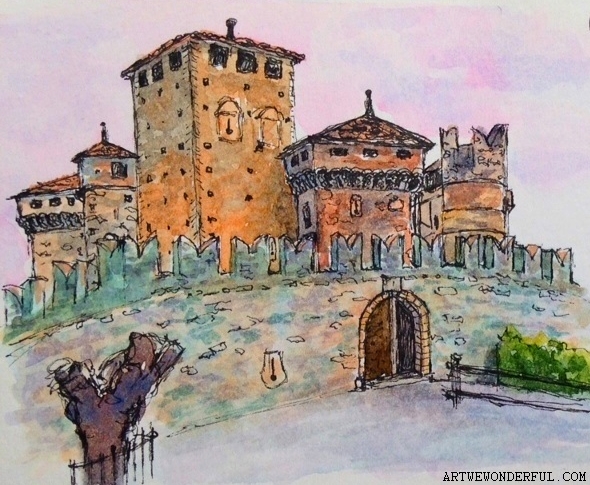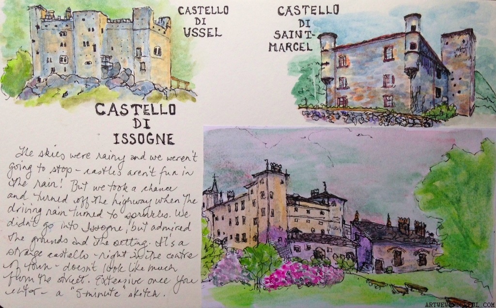 Here are the pages from my travel journal about these castles – they were quick sketches because we encountered lots of rain. Used my trusty .005 Staedtler pigment liner, and either watercolour or Inktense pencils.