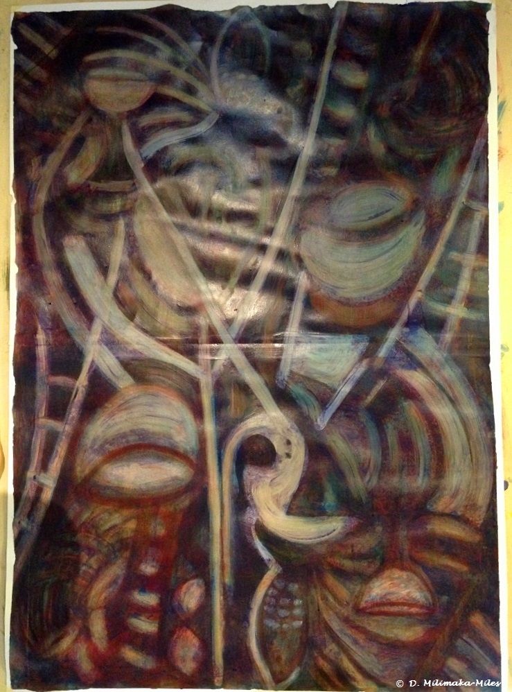 First up, we did collaborative abstract drawings in charcoal – a fun exercise to get the imagination fired up. We started by taking turns adding charcoal lines to each other’s canvases. Emerging shapes, themes and scenes were highlighted further in charcoal, then press-printed onto large sheets of paper which became glazed acrylic paintings. (I apologize for the less-than-stellar photography – some photos didn’t turn out at all and so some of my classmates’ works are missing.)