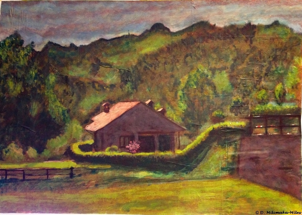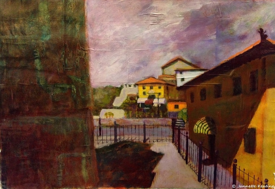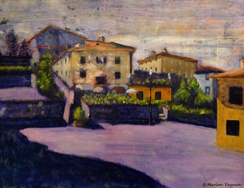 Now, before my tears of joy spill all over the keyboard, here’s the last batch of art. For this project, we affixed our large acrylic paper to boards and then prepared them with collages of newsprint and magazine images. Once dry, the boards were gesso’ed, and off we went to our drawing destination, the small town of Cascio. After selecting a subject from rough sketches (with the helpful input of our colleagues), we sat down at our easels to draw, and then lightly acrylic paint. A glaze of either red, yellow, or blue was then applied to the entire painting, and highlights removed with a damp sponge. More acrylic painting to add more definition followed, and if time allowed, the cycle was repeated using a different primary colour glaze than the first one used. After so much “working” of the canvas, the original newsprint collage starts to peek through, and provides very interesting textures and effects.