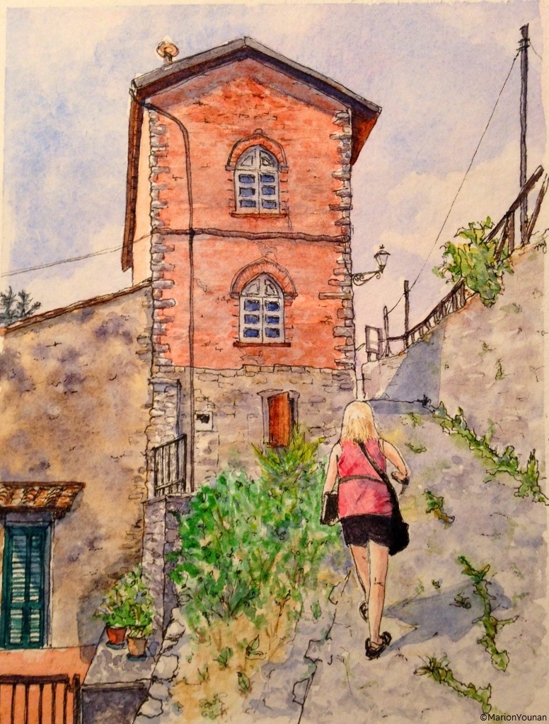 One of our contributors, Deb Milimaka-Miles just celebrated her birthday and has also just embarked on a new exploration of oil painting (hopefully we’ll see her new work posted here soon). To commemorate a new year and a new adventure, I made this pen and watercolour drawing from a photo on our art trip this past summer in northern Italy. Let’s raise a glass to the road ahead!