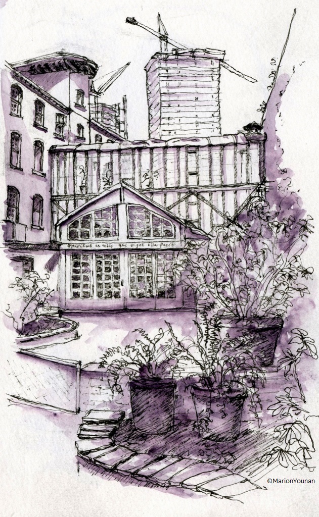 The Toronto chapter of Urban Sketchers met last weekend at this fabulous art space, 401 Richmond, and while standing in a shady corner of the inner courtyard, I did this sketch. Again, it got cold so I shortened my time by only painting the shadows. (Moleskine watercolour journal, Staedtler pigment liner .005 and .003, Moonshadow Daniel Smith watercolour for shading)