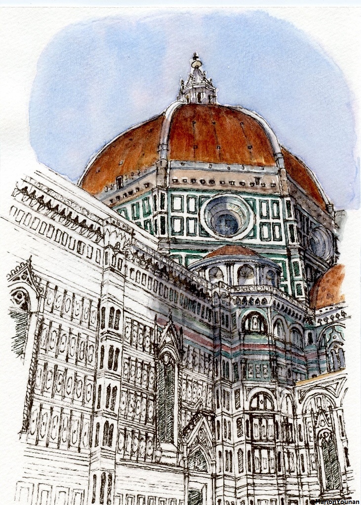 The Duomo (cathedral) of Florence always takes my breath away each time I see it. And this drawing nearly took my sanity away – yes, I went “detaily-detaily” on it. I’ve drawn it before, but never this much of it – here’s the side view.