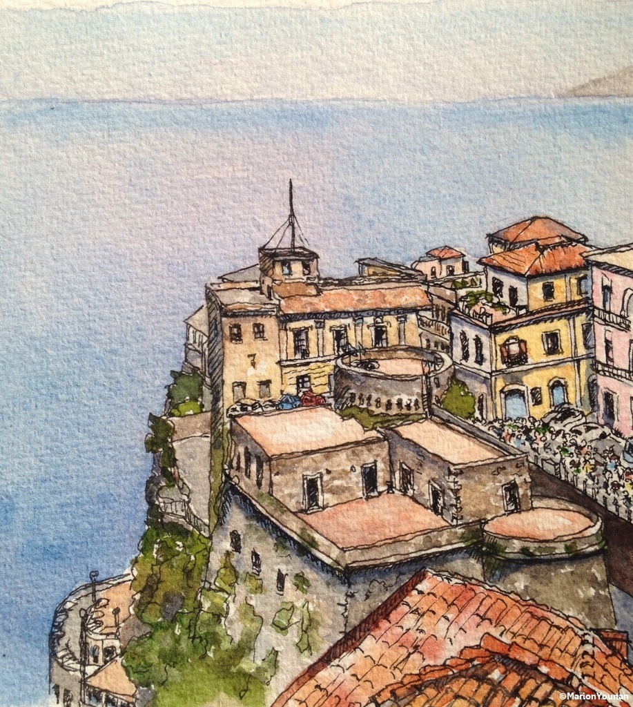 But I needed to draw, to capture some part of this gorgeous village. So I dragged my bones up the staircase to the roof terrace of the apartment, and sketched and painted the view. There are some crazy lines in this drawing, that I was going to correct later, but thought “nah” – that these wonky lines will remind me of my feverish attempt at art-making! Ha ha!