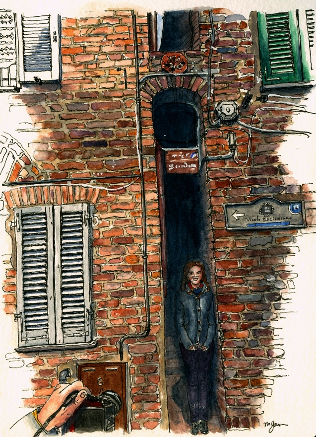 In this second drawing, I want to introduce May, a new artist whose exuberance and warmth comes through in her watercolour works. In this piece, also in Citta della Pieve, May poses for cameras in Italy’s narrowest street, Vicolo Baciadonne or the “Kissing Street” (so named because you could lean out the window and easily kiss your neighbour across the street!). Kisses and May go together so naturally!