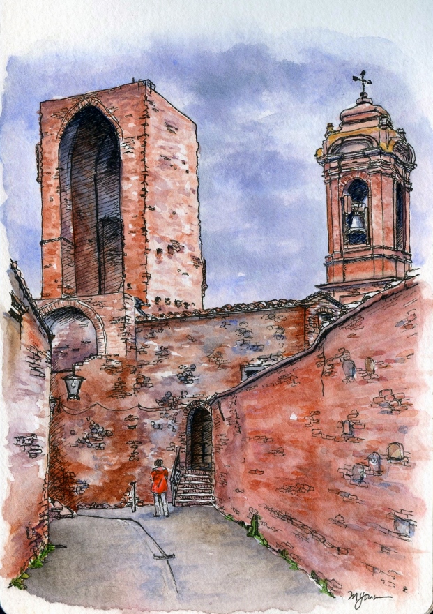 The first pen and watercolour is of Priscilla and her signature orange jacket, taking in the terra cotta and river rock in Citta della Pieve, Umbria. Priscilla is an abstract artist whose works are inspired first by her emotions of a subject and then her curiosity about it. I think that’s why our art group would often lose her on our town visits, as she would wander on her own journeys of discovery (she always found us though!). That’s why I love this photo memory and wanted to capture it in a drawing: She’s off down a long street away from us, likely doing quick sketches as the inspiration hits.