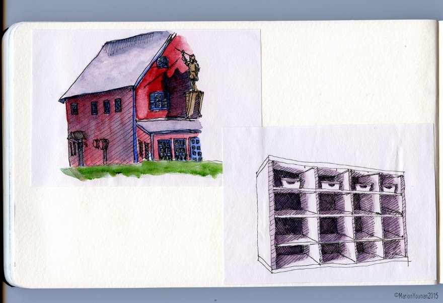 Inside the Little Sketchpad: Percé Fish Factory from a café table and A Shelving Unit Inside An Apartment