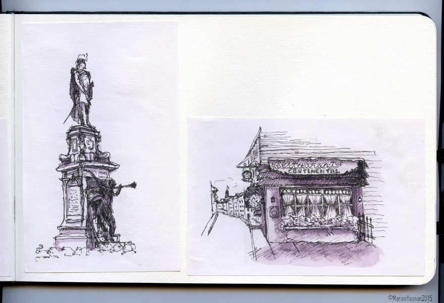 Inside the Little Sketchpad: Champlain Statue from a café table, and Rue St. Louis from a bench, Québec City