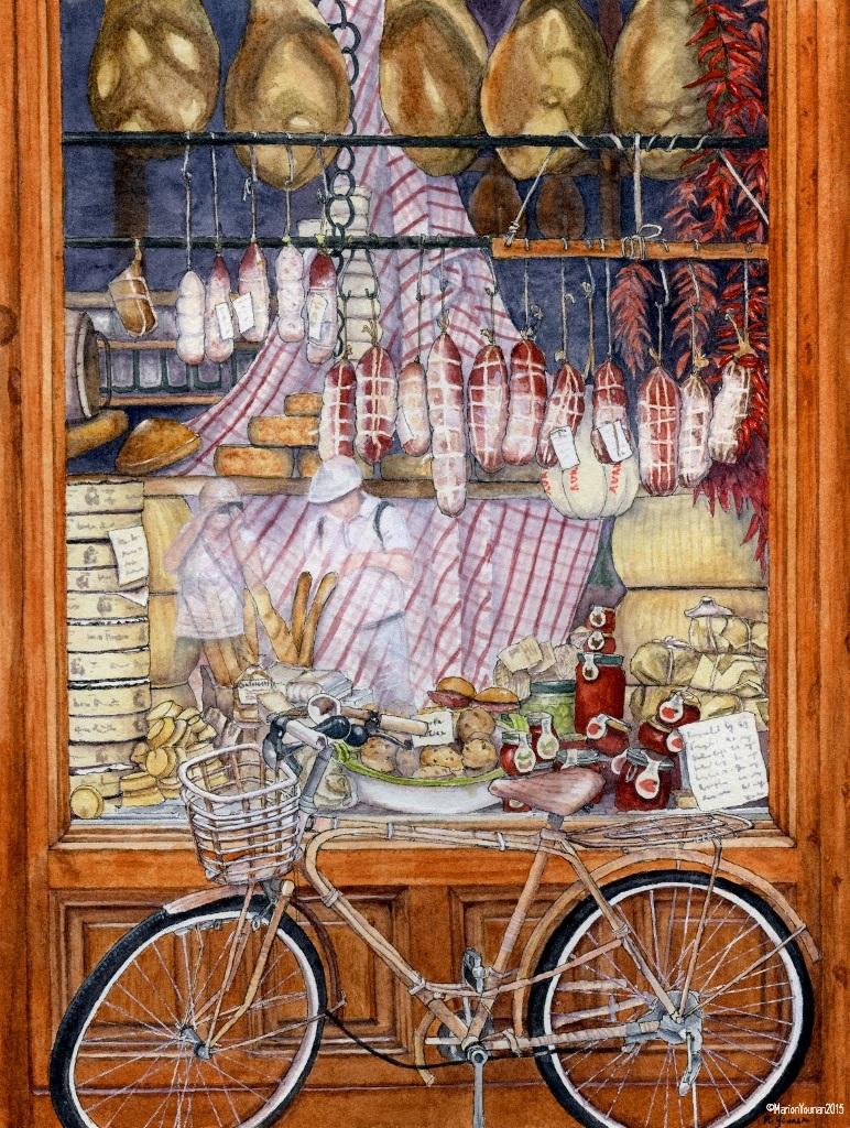 The “Sketchy Memory” is of a pizzicheria (deli shop) in Siena, Italy, taken from a favourite travel photo. The client told me they were happily surprised to see their reflection in the window with all these yummy Italian specialities and the iconic bicycle, and so she wanted the reflection to be present in the painting. As a fellow lover of Italian travel, this piece was a joy to do. And it stretched my planning skills in a big way because the timing of what-got-painted-when was important.