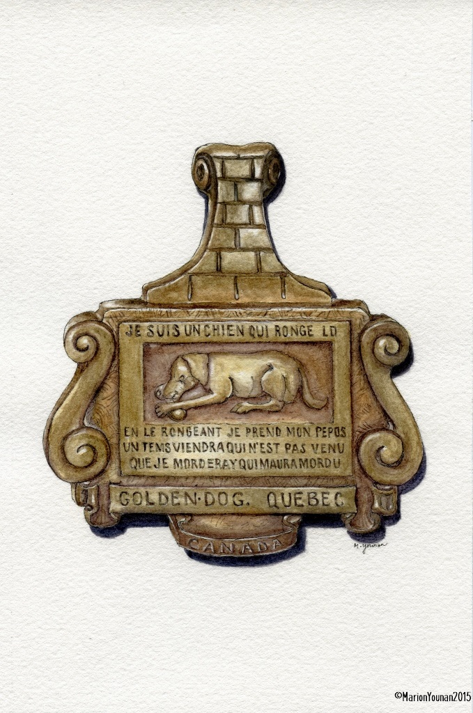 My next commission was of a family heirloom. The subject is a copper and bronze door knocker that hung on the family front door for many years. This door knocker was produced likely in the early 1930’s, replicating a bas-relief based on a late 1600’s story of revenge that took place in Québec, Canada. The story goes that a family dog was killed in a bitter war of neighbours over land rights, and after the dispute was settled, one neighbour had this bas-relief made and affixed to his house. The original bas-relief is now on the St. Laurent building in Québec City.  Its English translation reads: