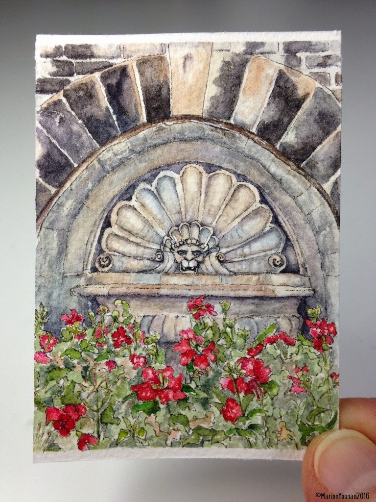 I could probably make all 100 art cards from pictures of fountains I’ve taken! But for now, here’s just one of them for card #13 – the lion fountain in Radda in Chianti.
