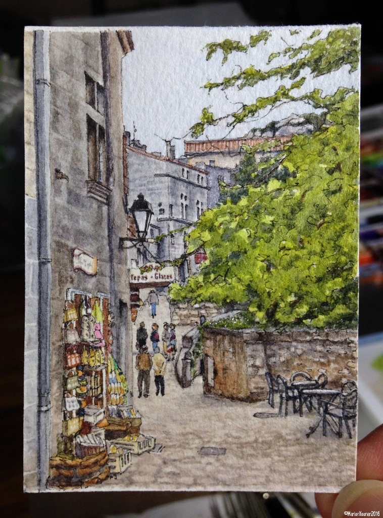 First mini is taken from a photo snapped while discovering the streets of Les Baux-de-Provence in the south of France in 2008. Everyone was out taking a late afternoon promenade, locals and tourists alike. I love this practice of strolling before a late dinner – there’s a real sense of community and I feel almost like an adopted local. People smile and say hello. And this town is so beautiful with so much stonework and colourful artisan shops, and flourishes of greenery overhanging the streets to escape the heat.