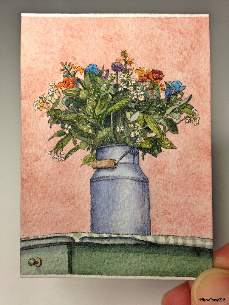 With all preparations done, I finally put brush to paper, and here’s the first mini of summer! Flowers! The photo source for this piece comes from the town of Bordighera on the Italian Riviera – this beautiful bouquet sat next to us on a green sideboard table at La Cicala, a fabulous seafood restaurant up in the old town. If you are visiting this area, an evening dinner here is a must!