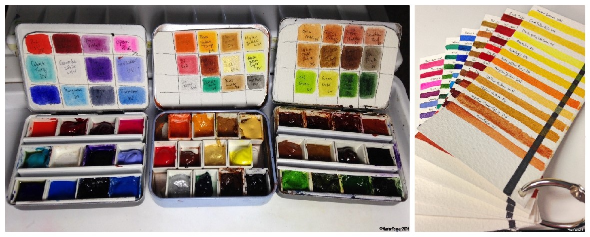 Then I got into preparation mode for summer painting – this meant cleaning up and re-organizing my travel palettes and making some watercolour opacity strips. Thanks to a great blogpost by Jessica Seacrest on travel palettes, I got my own in order, complete with making small legend cards to insert in the cases to help me remember what the colours are. I switched up a lot of my colours, and organized them into hues as best as I could. Then I went to work on making opacity strips, something I’ve been wanting to do since Shelley Prior introduced them in her classes. Taking a permanent black pen, like a Sharpie, draw a line down a piece of watercolour paper, then paint strips of similar hued watercolours full strength across the paper and write down each colour name and brand. In the Sharpie stripe, you’ll see if the paint is not visible (translucent) or you see some it (semi-opaque) or if you see a lot of it (opaque). I made 6 cards (reds, browns, purples, yellows, greens, blues) and attached them with a ring clasp. These strips are also handy when you can’t figure out a colour to use or blend – hold them up to your subject and pick the closest shades.