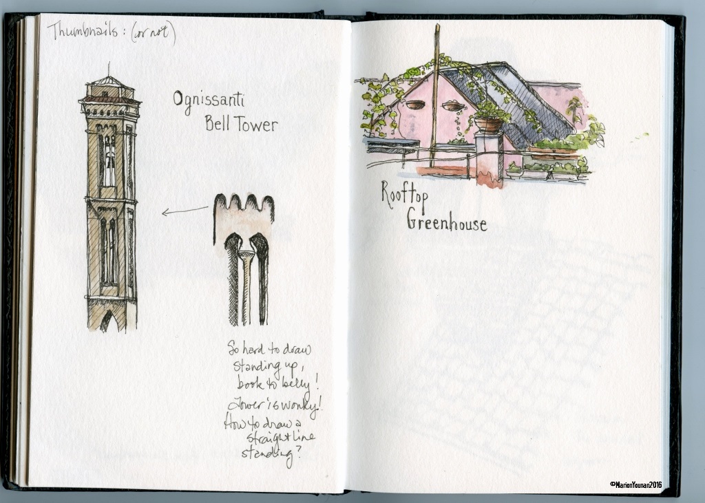 Then a standing sketch of the Ognissanti church bell tower out my western windows, where I was close enough to watch the bell ring back and forth several times a day. I wondered if someone was on the other end of the rope or was it some kind of computerized mechanism (the former, I hope). On the opposite page, I sketched a pink rooftop terrace where every morning a woman came up to survey her plants, check on her greenhouse, and do a little watering.