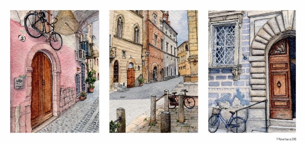 This Mini # 56 is drawn from a 2009 photo of a lone bicycle in a small piazza in Pienza, Tuscany. Probably someone home for lunch, as we have this habit of arriving in towns at lunch time when everyone is off the streets and things are closed! And we recently kept seeing this little piazza repeatedly over the last few days, watching the mini series “Medici Masters of Florence” filmed in Pienza and environs – but no bike!
