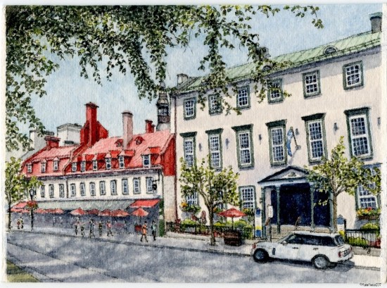 For my latest “Mini Vacations” miniature painting, I selected another Québec City subject from a recent travel photo of Rue Sainte-Anne from the leafy Place d’Armes park.