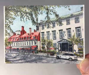 #70 – Along Rue Sainte-Anne, Québec City (ink and watercolour, 2.5″ x 3.5″)