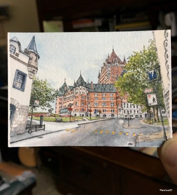 This is the historic and luxurious Chateau Frontenac Hotel, an icon of Québec City, Canada. Built in 1873 as part of a series of chateau-like hotels designed by the American architect, Bruce Price, this building is touted to be the most photographed hotel in the world. And many were doing the selfie thing from the vantage point of this 74th Mini, “A Chateau View, Québec City”.