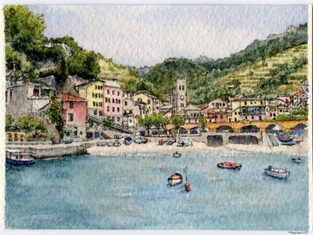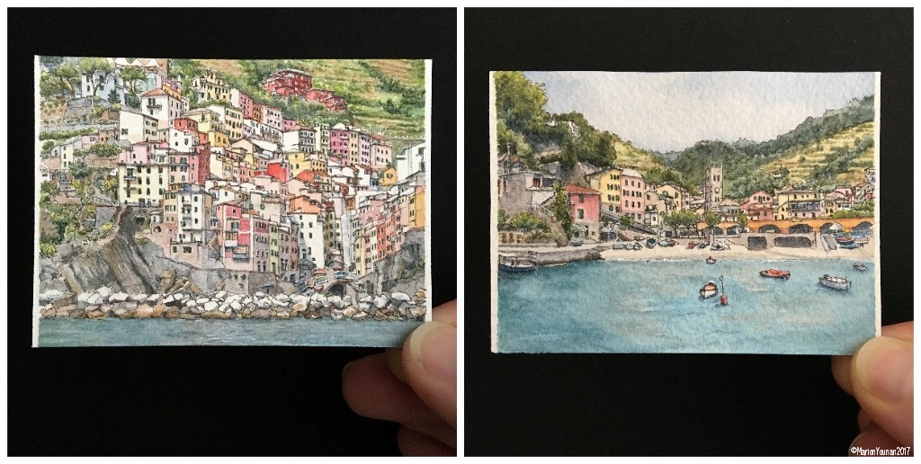 What took me so long? I didn’t have the viewpoints for Monterosso or Riomaggiore that I had of the 3 completed paintings (all taken from the coastal path), so I let my purist nature (lol) set aside the idea of painting these towns from other vantage points. However, after several requests this summer, I revisited my photos. As a subject, Riomaggiore is very complex – many more of the cliffside houses compacted together than the other towns – so I didn’t know if I could properly capture it in a miniature painting. And ironically, Monterosso has the opposite problem – not enough of the charming colourful houses or dramatic setting of its sister villages.