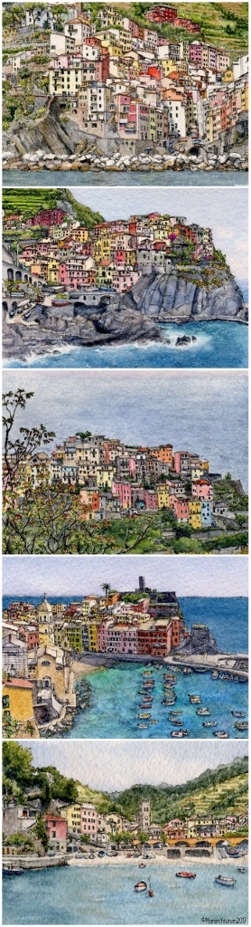 After several hours of editing Monterosso and Riomaggiore photos, I finally settled on two sea views of Monterosso (the old part) and Riomaggiore that seem to combine well with the other 3 completed village paintings.