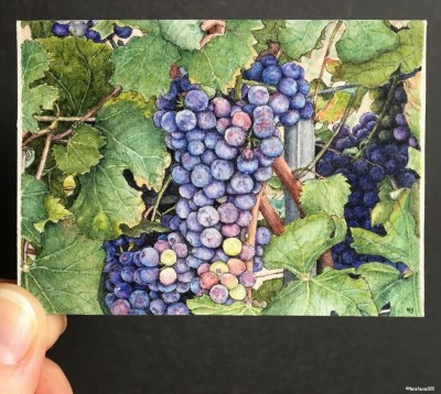 I reflect on this travel preference of mine today as I introduce my latest miniature. It’s from a photo on that memorable birthday trip. The four of us flew to Turin in Piemonte, and then headed to the Langhe where we walked through the hilly vineyards from one wine town to another. On those walks, we’d stop in at cantinas for wine tastings, some nibbling, and then head back onto the trails a bit flushed and usually very talkative. Outside of La Morra, we walked beside a vineyard that was full of ripe Barbera grapes, almost ready for harvesting. They were so enticing that we all stopped for photos. The one I chose for this piece is courtesy of my friend, Lisa, as she had the best grape photos of that day. While painting this piece, it definitely took me back to – you guessed it – the laughing, the conversations, and the dreaming in the company of some amazing women wanderers!
