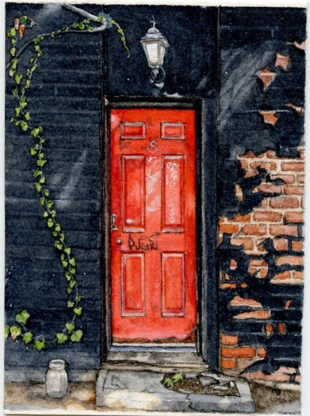 My first impression was “This door’s seen better days” – graffiti, peeling paint, strewn cigarette butts, a broken down stoop. Yet over to the left of the door, one lone spring-green trail of new ivy climbed up the wall. The people I was with had moved on down the street but I was still standing there transfixed. I was having a kinship moment with that door!