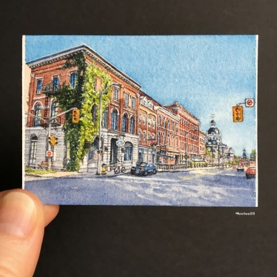 And after painting this one, I took on some historic buildings in the Ontario city of Kingston. I love these downtown scenes that celebrate their restored older buildings. I live in a city that has followed this path, but this one is spectacular in Kingston. So much beautiful detail – ornamental cornices, window mantles, tall windows, decorative brickwork… and some romantic climbing ivy! And the stately domed City Hall at the end of the street! No wonder that this city was once the capital of Canada – it sings pride of place and “O Canada” to me!