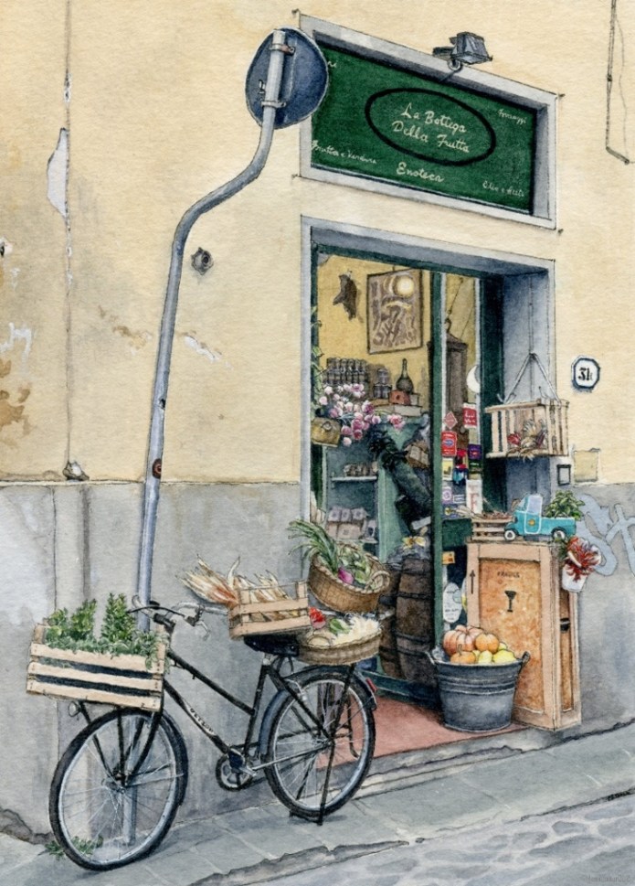 And that memory was with me as I painted this 5″ x 7″ ink and watercolour of the charming Florence shop that supplied all my delicious picnic ingredients: