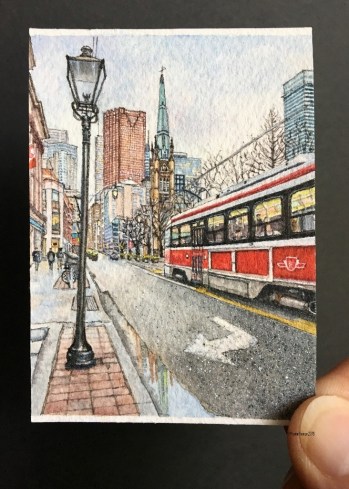 And I didn’t expect Toronto to do that shaking on a greyish day in February! No snow around, but the residual puddles from a recent melting reflecting the cathedral down the street. The random interior lights twinkling in the office towers, giving them a little sparkle. The rows of streetlamps standing guard on the sidewalks of King Street East. And just as a photo was taken, the red 504 King streetcar whizzed into the shot, filled with people on their way home. When I saw the photo, I was so taken with how atmospherically beautiful this city can be! And in February!