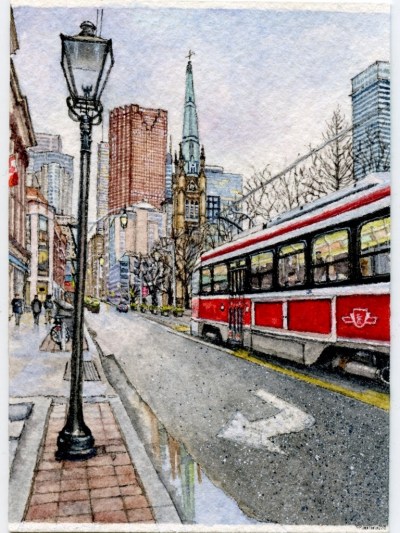 This past weekend, I took part in a large outdoor art show in downtown Toronto. Thousands of people attended, many of whom were visitors from other parts of the world. They had glowing things to say about Toronto, and naturally were very interested in my Toronto pieces. And they would get downright giddy when choosing from my selection of Toronto-themed business cards, showcasing the CN Tower or the red streetcars of the transit system.