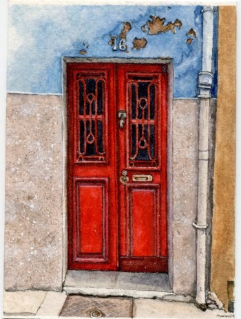 The first door I chose to paint is one I came across on my first day. I was drawn to the bright red door within the two-tone wall on a very steep street. When I got close to it and after a few seconds, I saw that each side was not symmetrical – one side was much longer, I’m guessing to accommodate the incline of the street. At first glance it looked perfectly symmetrical though. Hmm… either my old eyes were playing tricks on me or it’s a clever design trick.