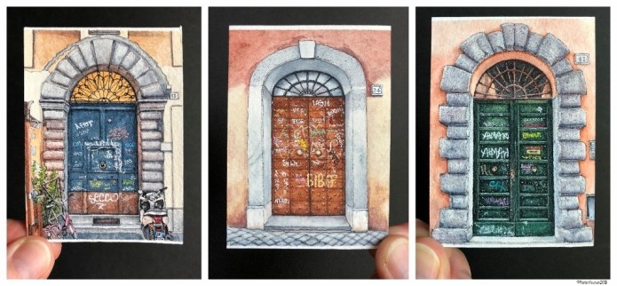 A few years ago, I painted 3 graffiti’ed doors from Rome and posted the before-graffiti and after-graffiti versions of these paintings, asking for reader preferences. The responses were split fairly evenly. I recall one comment stated how much more “life” was in the doors with graffiti, and this idea of “life” really stuck with me. I couldn’t look at graffiti again without being curious about the life that put it there.
