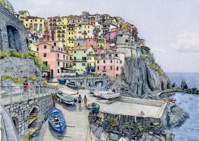 From that blissful day last July, this is my latest 5″ x 7″ ink and watercolour, “Manarola Summer”: