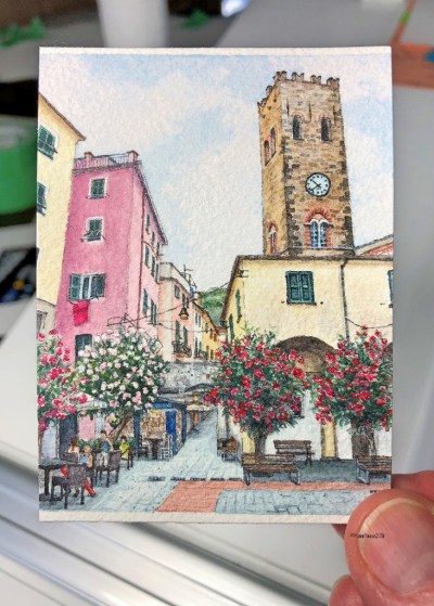 Inspired by a photo taken during one of those seaside walks in a much quieter Monterosso al Mare, my latest miniature is “Monterosso al Mare Colour”. Even though I had passed this exact scene earlier in the day on my way somewhere, I had completely missed noticing these blossoming trees and how gorgeous they made this little piazza. But during my passeggiata 10 hours later, I caught it all!