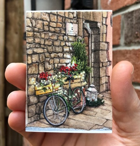 And it’s a street that keeps on giving, because on this particularly chilly night, I came across this doorway scene outside a shop in a building that was once Florence’s university. It had “Marion, paint me” written all over it – a decorative bike (which I can’t resist), vegetable crates with poinsettia flowers, sparkling lights, a medieval stone wall, and a lantern. These are some of my favourite things to paint! I stopped to take several photos for the inevitable future painting.