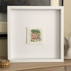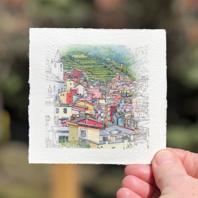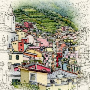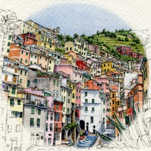 Enough artist rambling… here are the companion vignette miniature pieces “Uptown Riomaggiore” and “Downtown Riomaggiore”. (3″ x 3″ ink and watercolour)