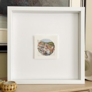 This curious truth has stayed with me as I started on some new work in the studio. What stays in focus when we travel, or for that matter, when we go through life? And afterwards, what do we remember? From these musings, I decided to try some vignette-style compositions in miniature – drawing an outline of a scene, painting in only some of the detail, leaving some in pastel fog. Additionally, I’ve created a frayed deckle edge to the watercolour paper rather than a clear cut edge.