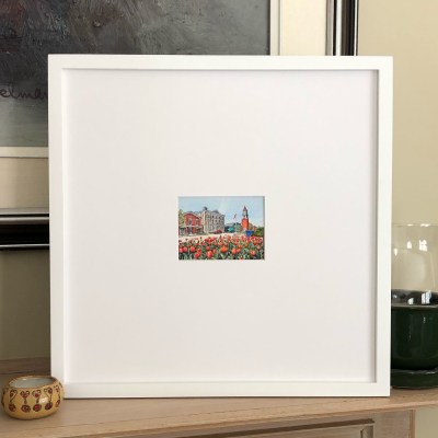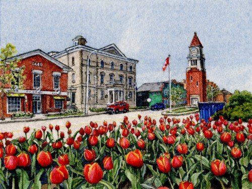 I remember last spring the world was reeling from so many hurts and losses, and as I often do, I escaped some of this pain by painting a cheerful subject. The subject was of a springtime tradition we’d undertaken each year, visiting nearby Niagara On The Lake to see the multitude of tulips along Queen Street.  In spring 2020, out-of-town visitors were told not to come due to the pandemic, and so we didn’t.