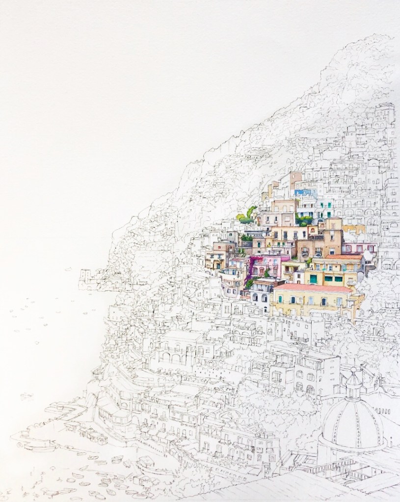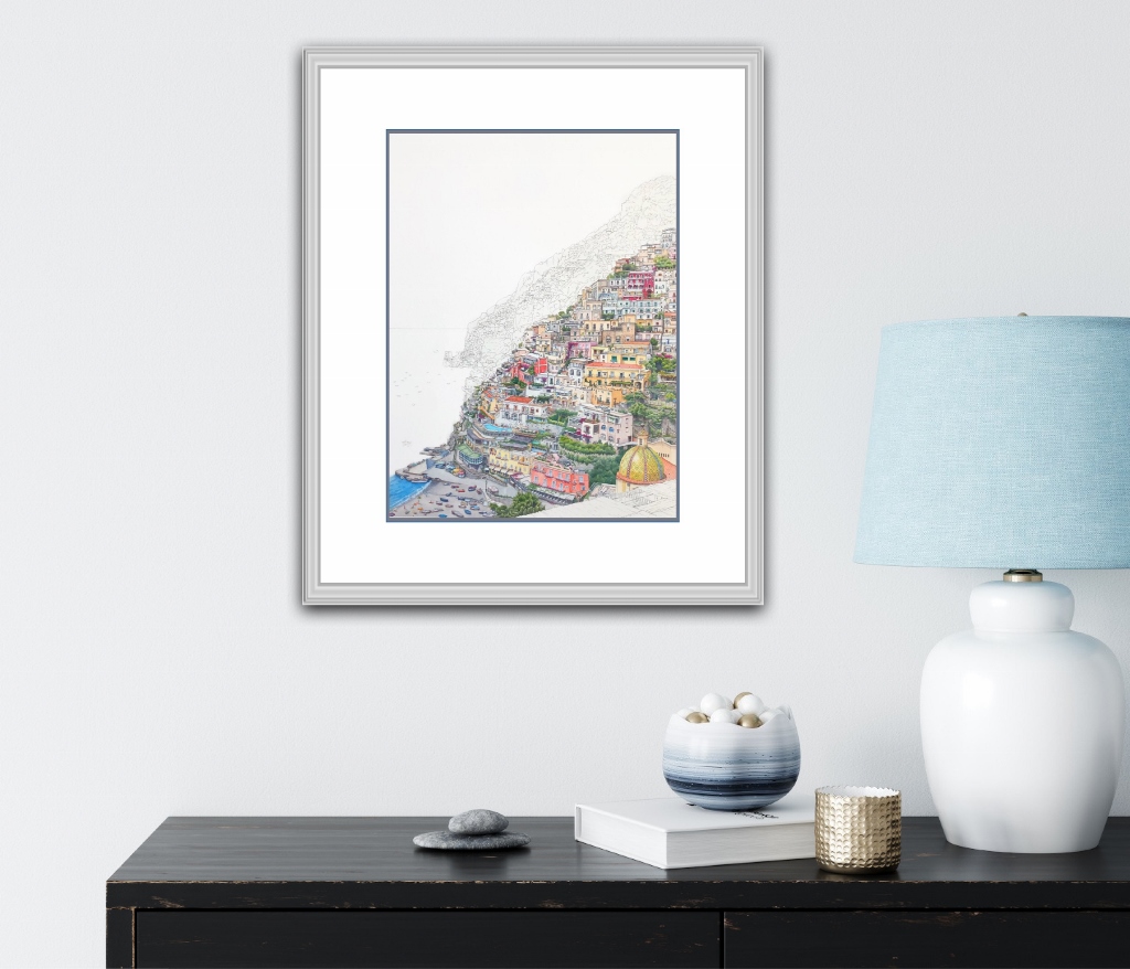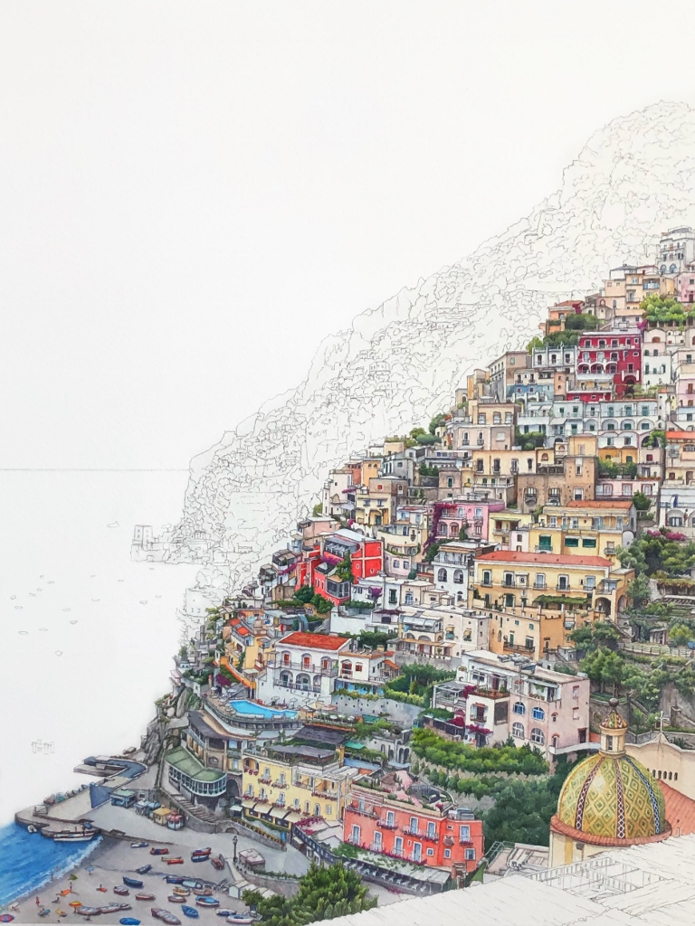 I got a sign of real hope – my husband got on a plane and flew to Italy this summer for an extended holiday. (Previous commitments didn’t allow me to go with him.) The first photos he sent back to me showed a more “normal” Italy and his trip made me see that travel (with care and respecting rules) was possible. And that maybe more normal times were just around the corner. So I dug “Positano” out of the corner, picked up my paintbrushes and joyfully completed it within 3 weeks – even experimenting with a different vignette composition!