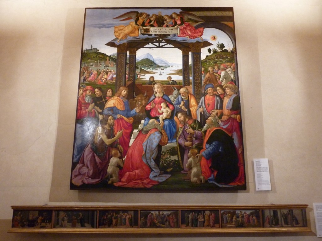 When I last visited the painting in Florence’s Museo degli Innocenti, the museum was very quiet on a hot August afternoon and I had the painting to myself for at least a half-hour. And at that time, I could get quite close to the work to luxuriously explore all the details… without multiple alarms going off.