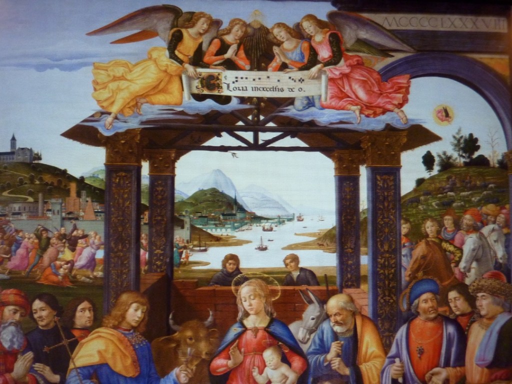 There was so much to take in: the bright colours of the clothing, the variety of portrait expressions, the landscapes in the background (is that Rome?), and playing “where’s Ghirlandaio” as he often painted himself into his larger works. And I was especially delighted with the 4 angels hovering above the manger announcing “Gloria in excelsis deo” like some kind of celestial billboard. Their hair and gowns and wings and feet! Spellbound!