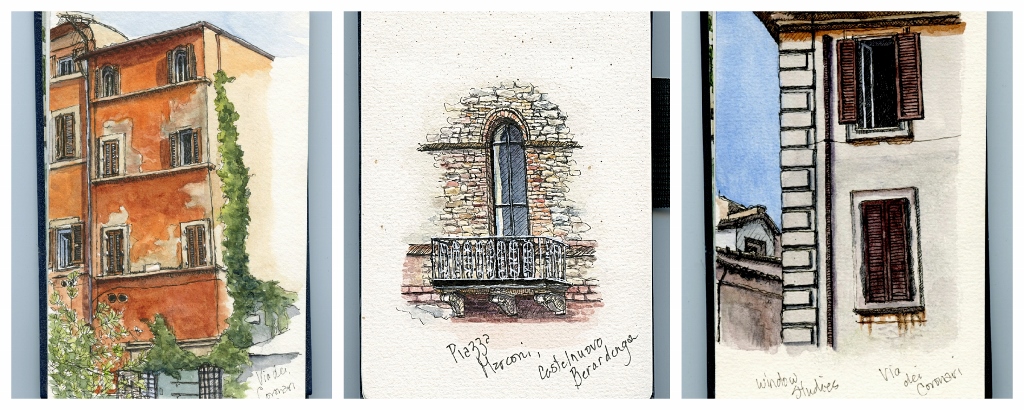 (Materials: The Italy sketches were drawn with Copic ink pens and painted with watercolour, and the New York sketches were also drawn with Copic pens but painted with Derwent Inktense pencils. I used 3 different small watercolour sketchbooks, all by Pentalic.)