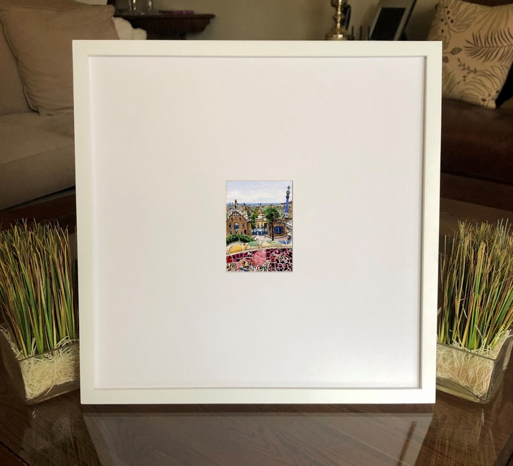 And the panorama in my new miniature painting, “Park Güell View Over Barcelona”, had me thinking the same thing in 2018 as I gazed out at the sprawling beautiful city to the sea. This park was originally supposed to be part of a unique housing development, designed by the creative genius Antoni Gaudi. He only saw a few homes of his dream neighbourhood built before the entire endeavour ran out of money. I kept wondering what if they hadn’t and this northern Barcelona neighbourhood was filled with these whimsical, fantastical homes like the two at the front gates of the park. Would I be tempted to put in an offer to secure one and live in this magical place? Likely I would if I could!