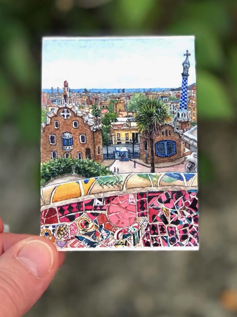 (“Park Güell View Over Barcelona”, 2.5″ x 3.5″ ink and watercolour; taken from a photo from Park Güell’s mosaic terrace; original available now in shop)