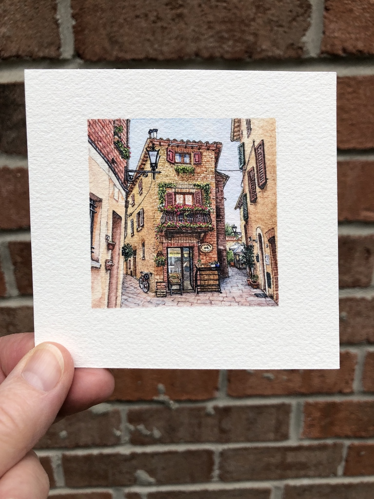 (“Pienza Corner Store” – 2.5″ x 2.5″; ink and watercolour; comes in an 8″x8″ white mat; now available in shop)