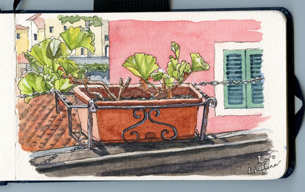 Now it was time to head to one of Tuscany’s prettiest towns, Loro Ciuffenna. I had heard about this town from a visitor to one of my art shows who does regular music residencies there. And it didn’t disappoint! The colourful city hall with the houses all nestled around it above the River Ciuffenna is a painter and photographer’s dream. We found a great restaurant just off the main square with river views for a delicious lunch of pasta with octopus sauce and salad – Ristorante La Torre. Delicious! And we chatted with the owner, Lorenzo, over coffee about his town, and how, in his opinion, it was one of Tuscany’s best kept secrets. We agreed. Over lunch, I even had time to do a quick sketch of the flower window box near our table.