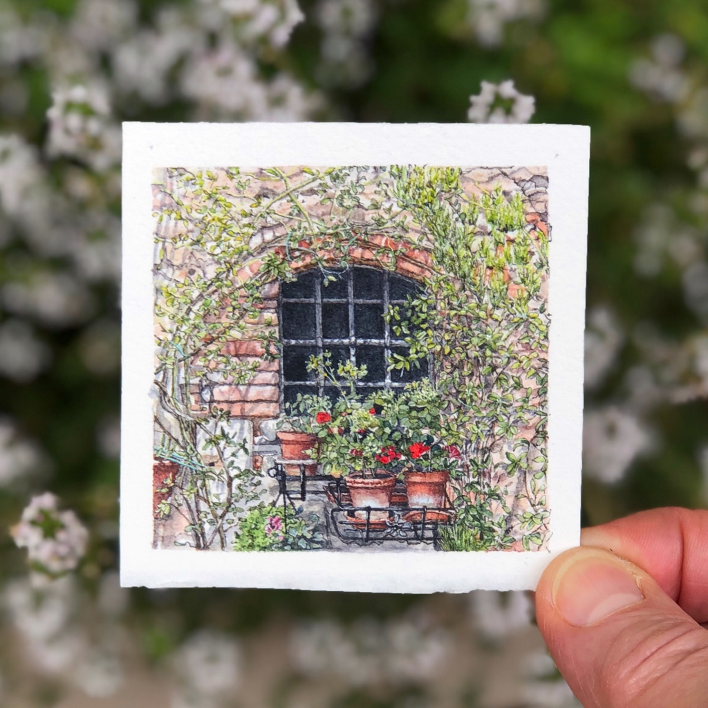 Our family has visited so many hamlets in Italy where either it’s so quiet you can hear the wind blow between the houses OR where there’s so much tourist traffic that a visit is stressful. When we were in Vertine a few summers ago, we were the only visitors, but we were struck by its balance of liveliness and peacefulness. A few village cats checked us out, and one friendly dog trotted along beside us as we walked every street. Village folks were doing odd jobs around their houses, looking up to say Buongiorno as we passed. And every building was so well-maintained and often draped in healthy plants and flowers. It was a Vertine home’s street garden filled with gorgeous plants and vines that inspired this 2.5″-square mini that I painted last year called “A Window Garden in Chianti”.
