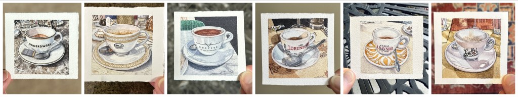 After 2 months in Italy last year, I had photographed several memorable cups, and so I thought it was time to add to my “mini cups of goodness” series with some new paintings. Here are 6 of them – all are 2.5″ x 2.5″ in ink and watercolour.