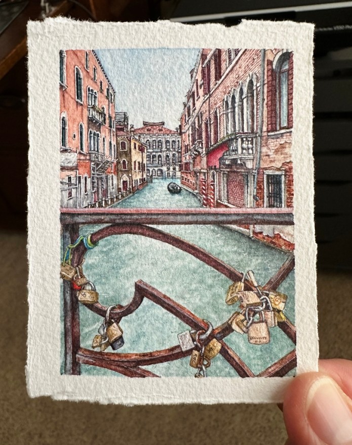 I know that many people find this love-locking a nuisance and a bit of kitsch, but I’m a big fan. I love the idea of leaving a tangible expression of your heart in a meaningful place. (There is a tree in Toronto with my husband and my initials carved in it from many decades ago – it’s still there!) So, it’s no wonder that I have captured this proof of Venice’s love powers in a miniature painting! This is the love-locked view on Ponte Nicolò Pasqualigo in a 2.5″ x 3.5″ ink and watercolour miniature: